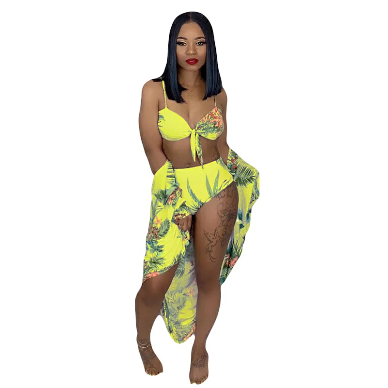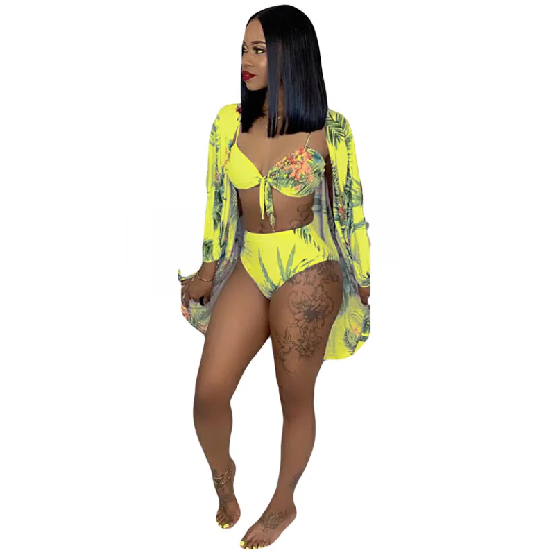 Free shipping Women 3 Pieces Set Leaf Floral Print Cloak Bandage Sexy Bra Cover Up Coat Bikini Suits Vacation Bea